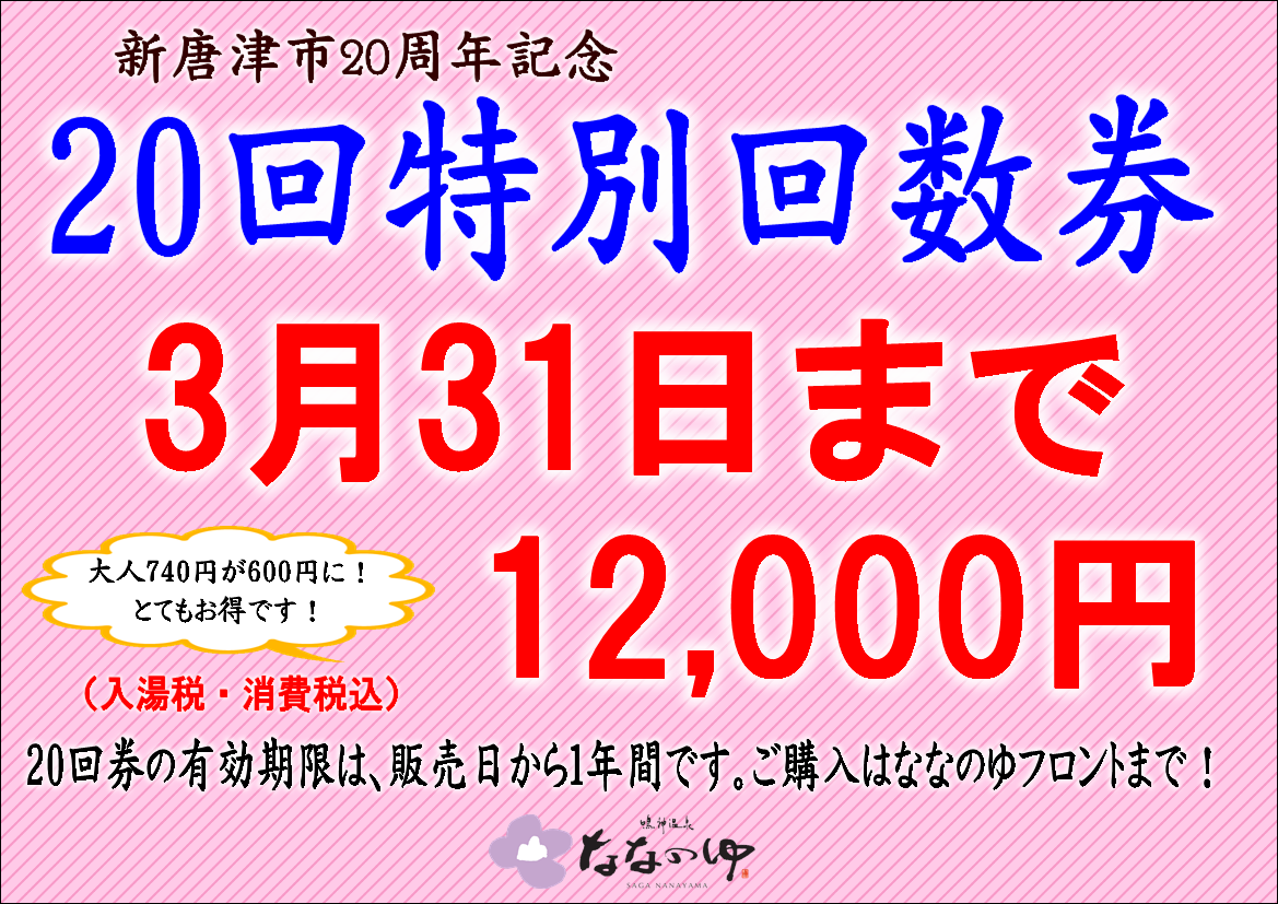 3月31日まで、【20回特別回数券】を12,000円(入湯税。消費税込)にて販売中です。