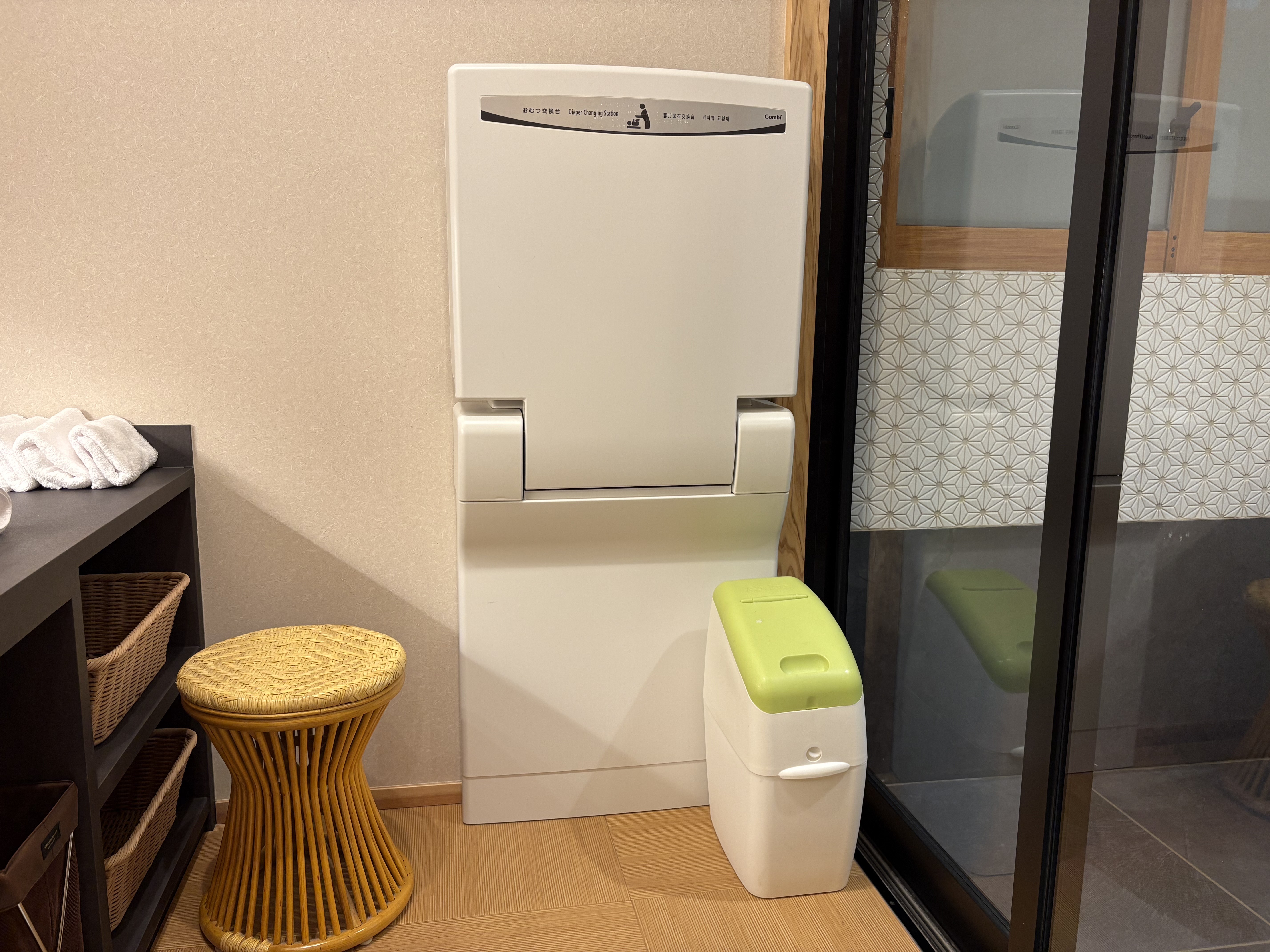 先日まで1つしかオムツ入れが無かったので、お子様のいらっしゃるお客様へ貸し出ししておりましたが、2つ目が入荷しましたので、十和田石の湯、青森ひばの湯、両方に常設いたしております。